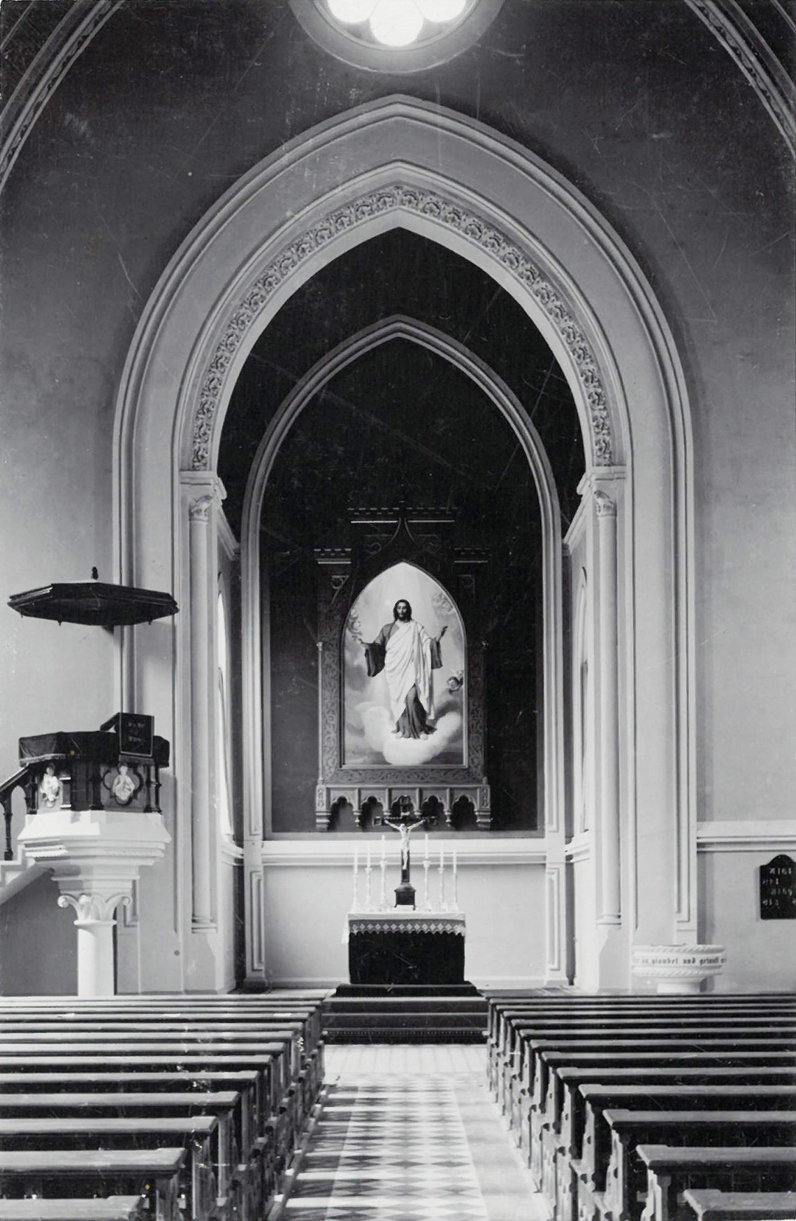 Die Apsis sollte von Beginn an ein Fresko aufnehmen, wofür die benötigten Mittel jedoch nicht ausreichten. So fehlte bei der Weihe 1881 dieses wichtige Ausstattungsstück, das erst hundert Jahre später realisiert werden sollte. Immerhin bekam die Kirche 1893 von Kunstmaler Ludwig Thiersch (1825-1909) ein Ölgemälde geschenkt. Für viele Generationen stand seitdem das Motiv des segnenden Christus in der zentralen Blickachse „mit weißen Gewand mit rotem Überwurf auf Wolken schwebend mit hellen Strahlen des himmlischen Lichts von oben – Berg und Meer zu seinen Füßen – auf beiden Seiten von Engeln umgeben.“