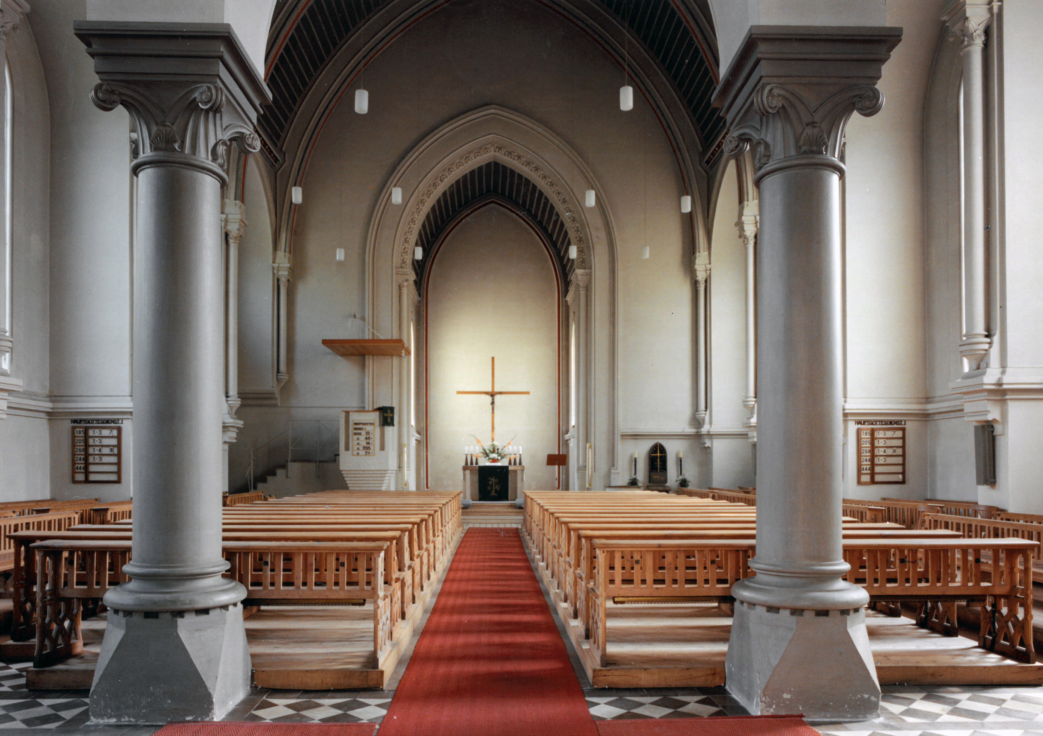 Die wenigen erhalten gebliebenen schwarz-weiß Fotografien täuschen über die dezente Farbigkeit hinweg, über welche die Kirche einst verfügte. Allein die von Pfarrer Theodor Hacker 1894 niedergelegte Kirchengeschichte läßt wage Rückschlüsse zu. Das äußere Mauerwerk zeigte sich demnach unverputzt in den „naturfarbenen Ziegelsteinen“. Gelbe, an ausgewählten Stellen rote Sandsteinen betonten das Portal, die Gesimse und Fensterlaibungen. Innen waren die Wände verputzt und in „graugelben“ Tönen gestrichen. Der umlaufende, mit einem Gesims betonte Sockel setzte sich mit einem etwas dunkleren Anstrich dezent von den darüber aufsteigenden Wandpartien ab. Einfache Dienste mit Basen und Kapitellen schmückten die Wandpfeiler. Ornamente aus Stuck zierten den Spitzbogen an der Apsis, die Gurte an der Decke und die Laibungen der Fenster. Die Fenster „einfärbig mattweiss“ fasste eine rote Bordüre. Das Gewölbe im Kirchenschiff und in der Apsis war „mit braun gestrichen Brettern“ verschalt. Das Gestühl mit aus Fichten- und Birnenholz geschnitzten Wangen war in Blöcken geordnet. Die Wege und freien Flächen dazwischen verzierte ein in Rauten verlegter Fliesenboden aus zementgebundenen beigen und dunkelbraunen Platten.