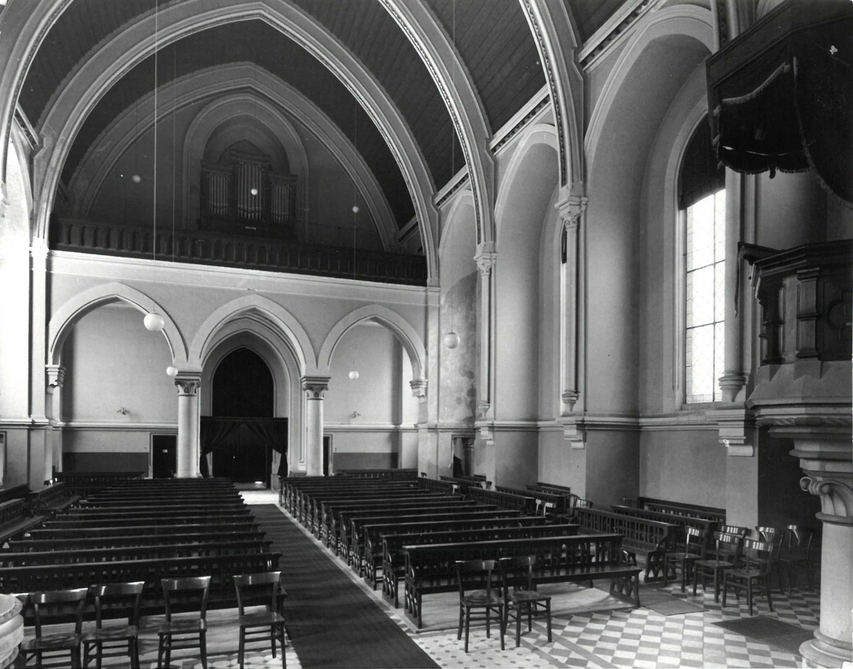 Links stand ursprünglich eine aufwendig gestaltete Kanzel, monumental präsentierte sie sich nach allen Seiten. Sie ruhte auf einer verkürzten Säule mit Kapitell und kräftigem Gebälk. Die Säule definierte den Eckpfeiler eines Einbaus, in dem die Sakristei untergebracht war. Sie war mit einem Dachaufbau versehen, der einerseits ihre physische Präsenz im Kirchenraum hervorhob, andererseits die akustische Verständlichkeit optimierte. Rechts trug ein Säulenstumpf, welcher mit einer quadratischen Plinthe und einer runden Basis mit Hohlkehlen und Wülsten fest mit dem Boden verbunden war, das Taufbecken.