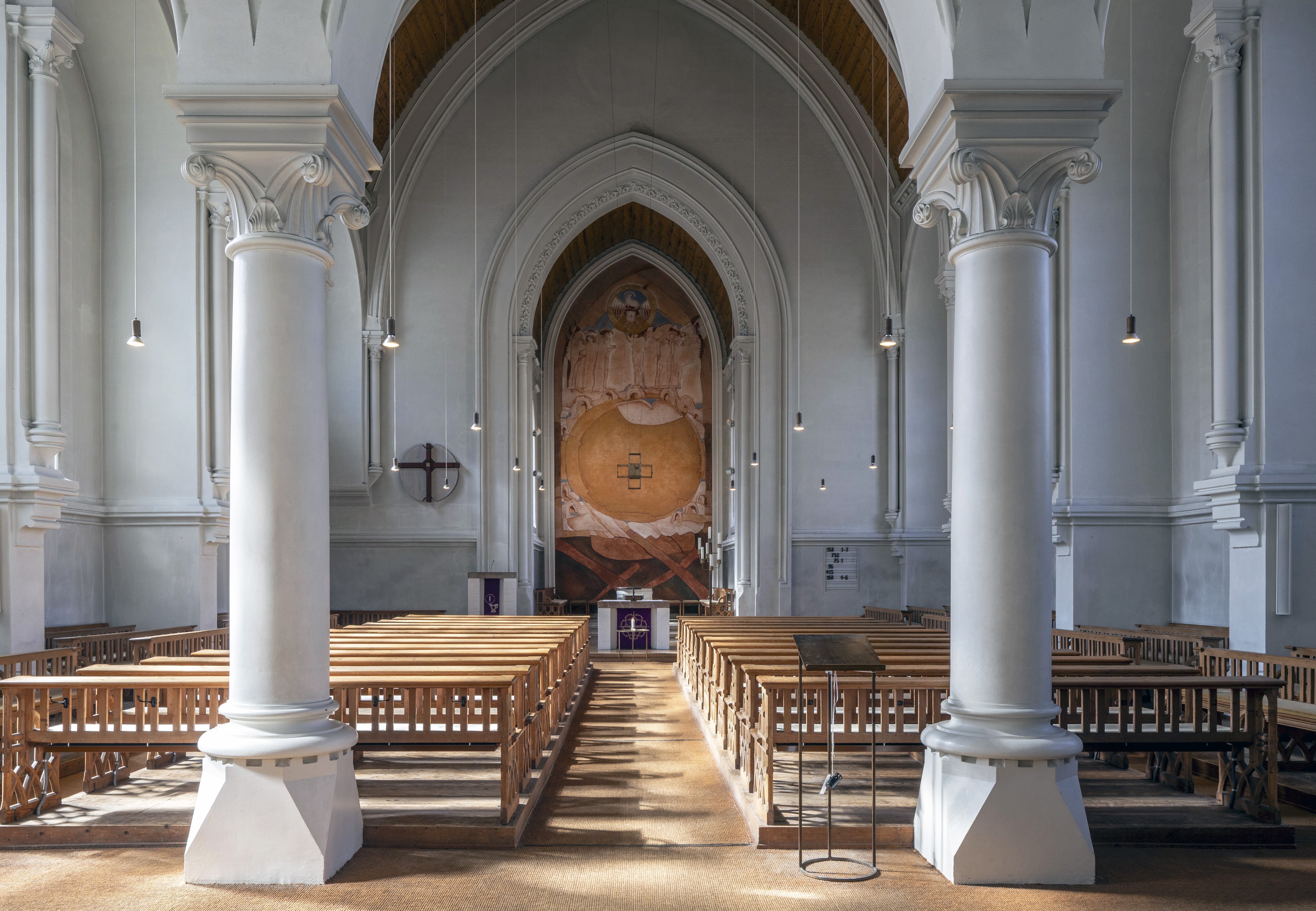 Die hellbraune Farbe des Teppichs korrespondierte mit dem warmen Holzton des Gewölbes und den historischen Kirchenbänken, zudem harmonisierte sie mit dem an der Rückwand der Apsis neu geschaffenem Wandbild vom „Himmlischen Jerusalem“.